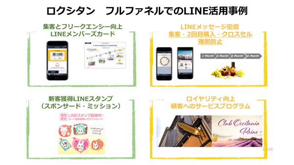 獲得した「友だち」とのコミュニケーションには大きく4つの軸があるという。まず、集客とフリークエンシーの向上。店舗で配布しているポイントカードをLINEの中で使えるようにする「LINEメンバーズカード」を公式アカウント内に実装し、会員化を促進している。2つ目は、集客やリピート・クロスセル、離脱防止を目的に行っているLINEメッセージ配信。特定のユーザーに対して最適化されたメッセージを送り分けることのできる「Messaging API(旧LINE ビジネスコネクト)」を活用している。3つ目は、新規獲得のためのLINEスタンプ施策。「スポンサードスタンプ」の他に会員情報の登録を条件にスタンプをダウンロードできる「ミッションスタンプ」も実施している。4つ目は、ロイヤリティ向上のためにサービスプログラムの提供。ロイヤルカスタマー向けに「クラブオクシタニア レーヌ」という会員ステータスを用意し、特別な特典をLINE経由で提供している。