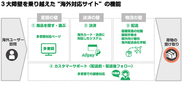 そして「国際貿易の知識」を前提とした「通関手続き(インボイス作成)」「海外向けの梱包」「海外配送会社の手配」を介して、無事に日本から海外ユーザーの元に商品が届くことになる。加えて、商流の中で起こりうる問い合せに「外国語での顧客対応」が付帯されれば、安心して買い物ができ、顧客満足度の高い海外対応サイトと認識してもらえるだろう。
