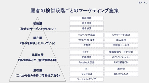 才流では、顧客の検討段階ごとに適したマーケティング施策を、次のようにマッピングしている。