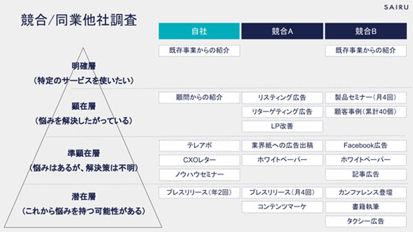 以下の図は、顧客の検討段階ごとに、他社がどのようなマーケティング施策を打っているかを調査したものだ。