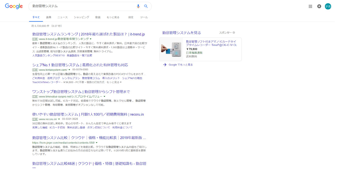 しかし、損する会社は、競合/同業他社の取り組み状況を調査せず、非効率な打ち手を選択してしまう傾向がある。一例として、「勤怠管理システム」で検索した時の画面を見てみよう。