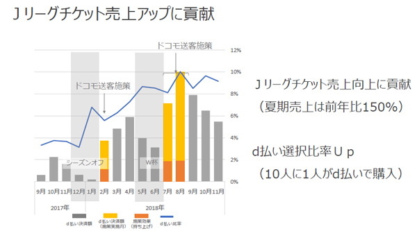 石村:d払いによるチケット購入の絶対数と比率が上がり、Jリーグチケットにおけるチケット購入のうち10人に1人がd払いを選択しています。これはd払いの一般的な比率よりも、非常に高い数値です。