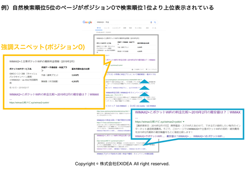 一方、現時点で“機械”がどのようなコンテンツを高く評価するかは、キーワード検索結果で上位表示されるWebサイトやページを確認すればわかりますが、中でも注目がGoogleの検索結果最上位に表示される「ポジション0(ゼロ)」(強調スニペット)です。検索結果1位サイトよりもSEO効果が高いと考えられるポジション0表示は、ある意味で検索エンジンから最高の評価・信頼を得たコンテンツと言えます