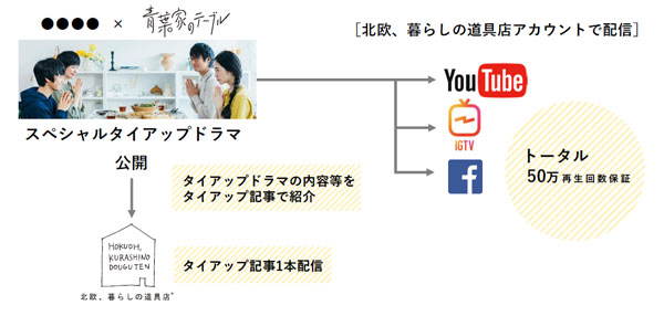 『北欧、暮らしの道具店』では、「青葉家のテーブル」というオリジナルドラマの制作・配信を行っている。今回発表されたタイアッププランでは、この「青葉家のテーブル」のアナザーストーリーとして、スペシャルタイアップドラマを制作し、『北欧、暮らしの道具店』をはじめ、YouTube、IGTV、Facebookで配信する。
