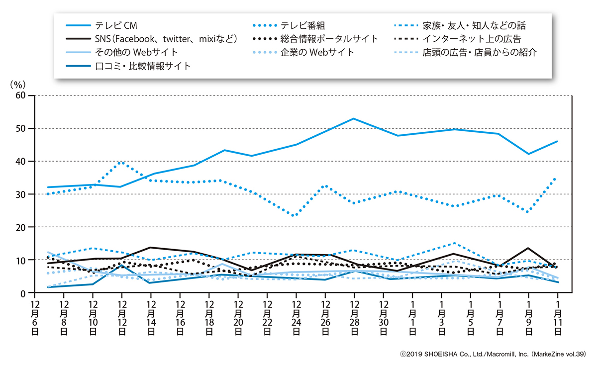 「テレビCM」、「テレビ番組」が高く推移しており、認知率が上昇中であった12月12日には「テレビ番組」が40%に達して「テレビCM」を上回った。その後、「テレビCM」が順調に伸び続けるのに対し、「テレビ番組」のスコアは徐々に下降し30%前後で推移している。