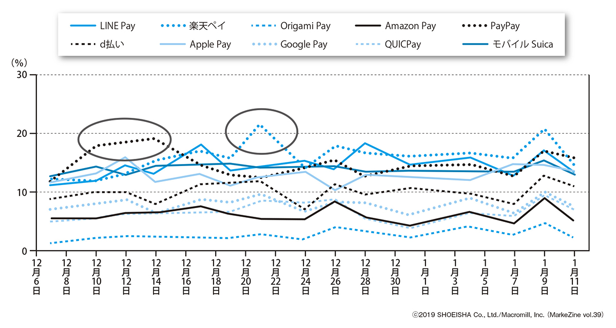 PayPayのキャンペーンは、開始からわずか10日間という予想外の早さで還元金額が100億円に到達し終了を迎えたことも話題となった。キャンペーンが終了した12月13日の前後である12月10日〜14日、PayPayの利用意向の高さは1度目のピークを迎えている。この時期には、キャンペーンのインパクトや、あまりにも突然の終了などがマスメディアなどで取り上げられており、前掲の認知経路のチャートからもその効果が推察される。その後、利用意向は2019年1月9日〜11日にかけて再度上昇しており、この時期はキャンペーンのポイント付与のタイミングと重なる。一方、12月16日からのスコアの下降にも注目したい。このタイミングは、“クレジットカード不正利用”が報じられた後であり、ネガティブな反応が顕著に確認できる。