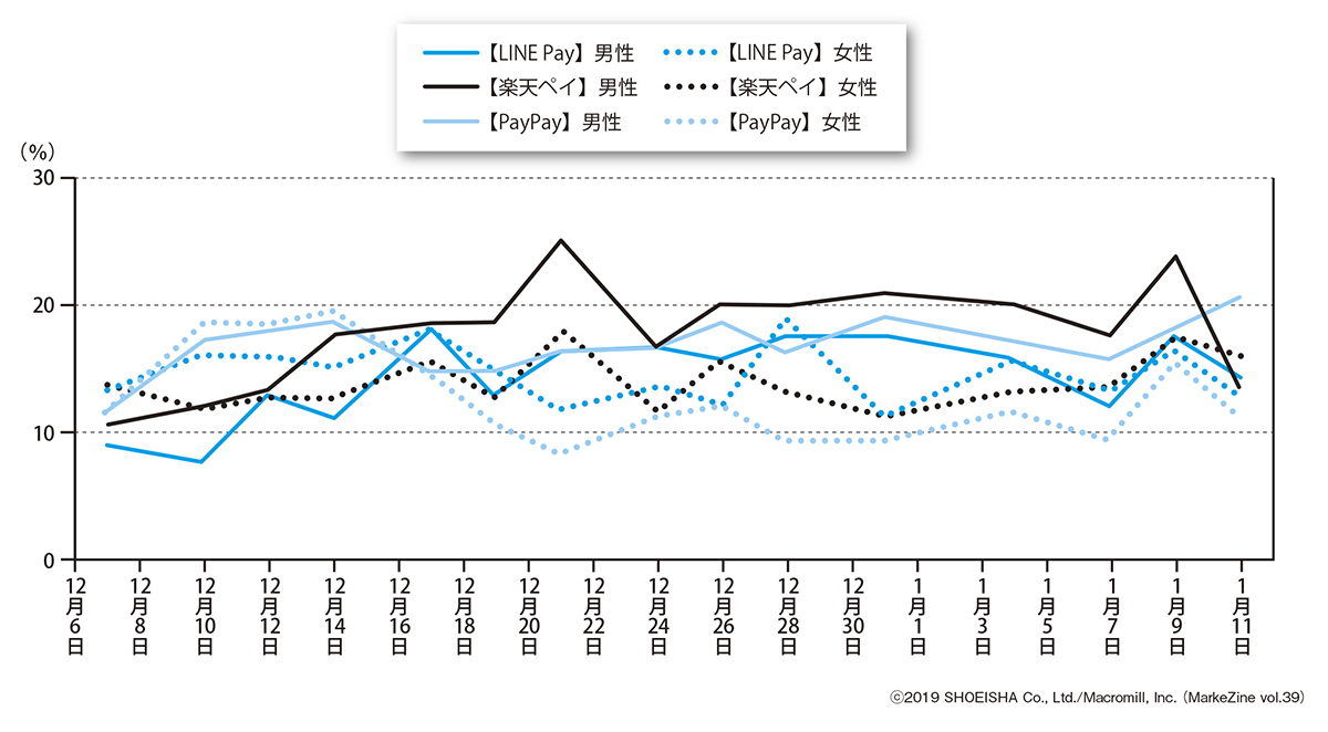 「PayPay」と「楽天ペイ」は、12月中旬以降から男性のスコアが高い傾向が続いた。一方、「LINE Pay」では、期間当初は女性のスコアが高かったものの、12月中旬以降、男性が同等以上となる日付があった。あくまでもこの3サービスの範囲ではあるが、年末年始の一連のキャンペーンや報道によって利用意向が高まったのは、共通して女性よりも男性だった。