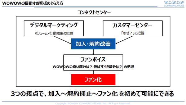 デジタルマーケティングとコールセンターで「加入・解約改善」を行い、ファンボイスによって「WOWOWの良い部分」「ファンを増やすために伸ばすべき部分」を把握する。WOWOWのコンタクトセンターは、これら3つの接点が揃って初めて完成するのだという。杉本氏はWOWOWのマーケティングが目指す姿を次のように述べ、セッションを結んだ。
