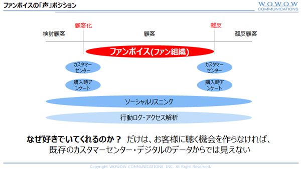 そこでWOWOWは、コンタクトセンター内での新しい取り組みとして、無償で月2回のアンケートに回答してくれる協力的なファンを集めた組織「WOWOWファンボイス(以下、ファンボイス)」を設立。「ファン化」のプロセスに迫っていった。