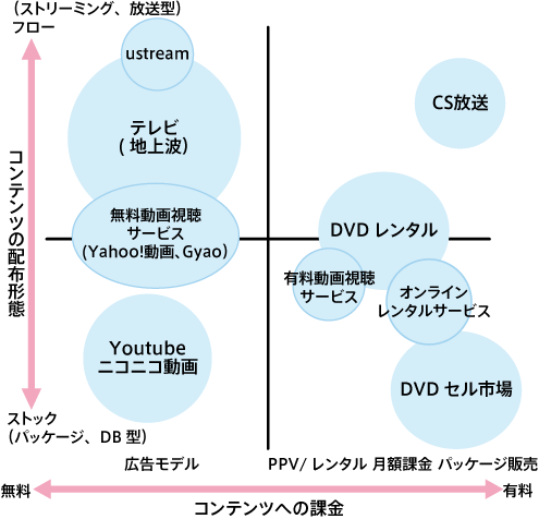 そのようなビジネスモデルや映像メディア全体について、コンテンツ課金の有無、及び放送やストリーミングなど一時的に情報が流れていく形態なのか、あるいはパッケージやデータベースを主体としたストック型のサービスなのかを軸に分類してみる。