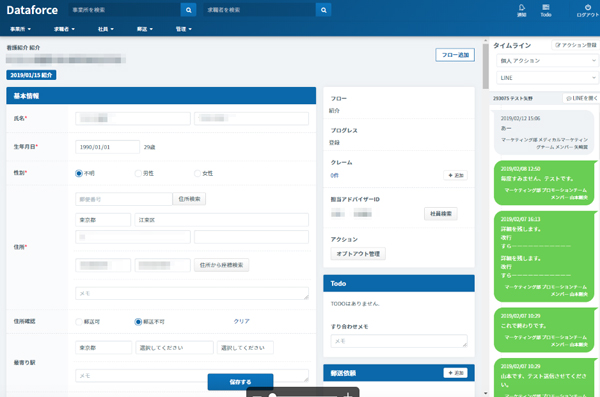 だが、CRM/SFAベースで社内にログを残しておけば、その心配はしなくて済む。求職者へ対する対応の経緯を前任者から引き継ぐ時にも、CRM/SFA側に過去ログがあるとスムーズに進む。加えて、派遣人材の紹介サービスの場合、求職時のキャリアコンサルタントと、実際に勤務開始してからのフォロースタッフが別になるケースがあるが、そうした時でもLINEのログが残っていれば、適切なフォローができるという。