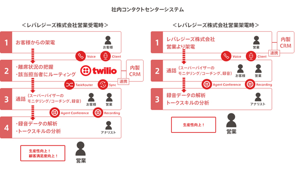 レバレジーズでは以前からIP電話自体は導入していたが、ログや音声の取得は管理画面から都度手作業で取得する仕組みになっており、IP電話機のセットアップなどの運用負荷が高い状態だった。そこでCRM/SFAリニューアルに合わせてTwilioを導入し、IP電話機を撤廃。CRM/SFA画面上の顧客プロファイルに表示されるダイヤルボタンをクリックすると、そのままユーザーに電話がかけられるようにした。インカムのみで運用でき、発信着信ログや会話音声データも自動で蓄積されている。