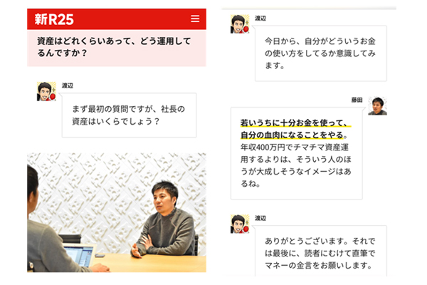 渡辺:まず「読者目線」に関してですが、新R25の記事は、インタビュアーが取材対象に読者目線の質問をぶつけて、その質問を起点に記事が展開していくような作り方をしています。細かなこだわりですが、インタビュアーの吹き出しが左に位置しているのもその理由です。