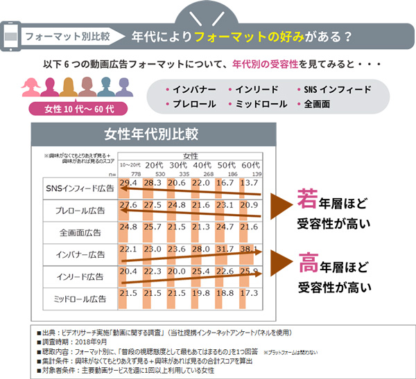 他方、年齢があがるにつれ受容性が高くなるのはインバナー広告とインリード広告であった。いずれも動画サイズで言うと他のフォーマットに比べて小さめであることから、高年層ほどインターネットの利用体験をジャマしない広告のほうが見てもらえる可能性が高いというのも、興味深い結果だ。