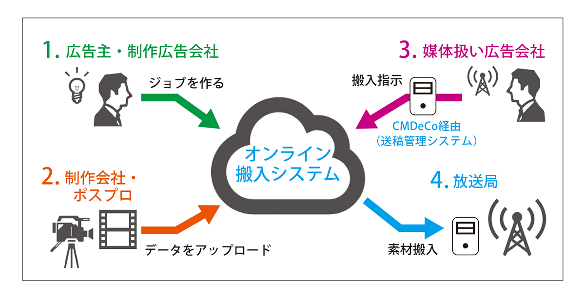 オンライン運用とは、広告会社、制作会社、放送局など、テレビCMの企画・制作・出稿に関わるすべての関係者を連携し、テレビCM素材のオンライン送稿を行う仕組みです(図表6)。