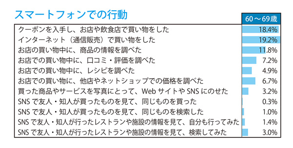 人付き合いの範囲を広げようとする意識が薄く、ネットで話題になっているものや、口コミには誘導されない。そして機能性を重視し、自分のこだわりを強く持って購入を決める。この傾向を裏付けるように、スマートフォンの行動でも、SNSで影響されて商品を購入するというような傾向は低くなっていました。このような価値観が、シニア層の間でSNSの普及がなかなか進んでいかない要因の一つなのかもしれません。