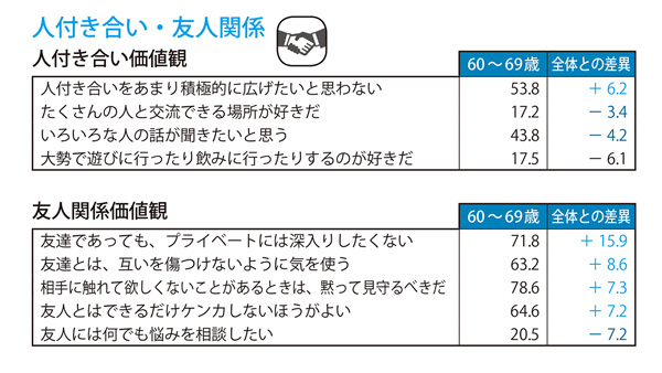 これによると、人間関係の構築においては「人付き合いをあまり積極的に広げたいとは思わない」といった考えを持つ人が多いことがわかりました。また現在の友人関係については、「友達であっても、プライベートには深入りしたくない」「相手に触れて欲しくないことがあるときは、黙って見守るべきだ」というように、自分の本音を包み隠さず話し、何でも悩みを相談したいというよりは、お互いのデリケートな部分には触れず、傷つけないように気を遣って接するのが望ましいと考えているようです。インターネット上でも、新たに人間関係を広げるよりも今つながっている人たちとの関係を大切にしたいという価値観が強くなっています。