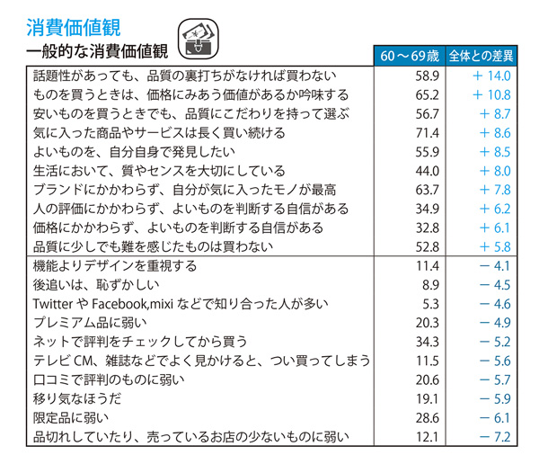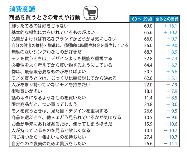 また、消費意識や価値観について見てみると、若年層とは少し異なった傾向が浮き彫りになりました。シニア層では「話題性があっても、品質の裏打ちがなければ買わない」、「ものを買うときは価格にみあう価値があるか吟味する」といった考えが強くなっていて、インターネット上で話題になっているものや口コミへの関心は低く、実際に自分で試して、より良いものを自分で選んで発見していきたいという意識が強いことがわかりました。また商品に望む要素としては、「デザインよりも機能」。わくわくするような見た目や新しい機能よりも、基本的な機能や品質がしっかりと保証されている商品を提供して欲しいという考えを持つ人が多くなっています。