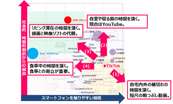 ここで仮に、TikTokがさらなる利用拡大を図るとしたらどのような方向性があり得るか、ということを考えてみる。この事業戦略的な視点でマッピングを見ることが、実は若者における動画メディアと生活行動の関係性を理解することにつながる(図表4)。