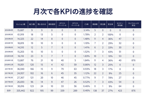 サイトの訪問数からCV数、商談数、受注数の推移を追いながら、目標に達しているか、どこがネックになっているかを隔週で議論していた。数字が横ばいになっていれば追加の施策を検討し、常に右肩上がりで数字が推移するように気をつけていた。