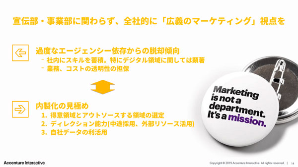 さて、議題は最後のテーマ「広告主(宣伝部/事業部)、エージェンシーに求められる新しい役割」へと移る。望月氏は、“Marketing is not a department. It's a mission.”と提示し、マーケティングは部門でなく各事業部の一人ひとりの社員が意識すべき“ミッション”であるとのメッセージを強調する。