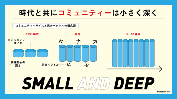 田中:企業にとってコンテンツとは、コミュニティを獲得する手段の一つです。コミュニティを構築して維持して、そこでマネタイズしていく。その時に意識しておくと良いのが、「時代とともにコミュニティは小さく深くなっている」ということです。
