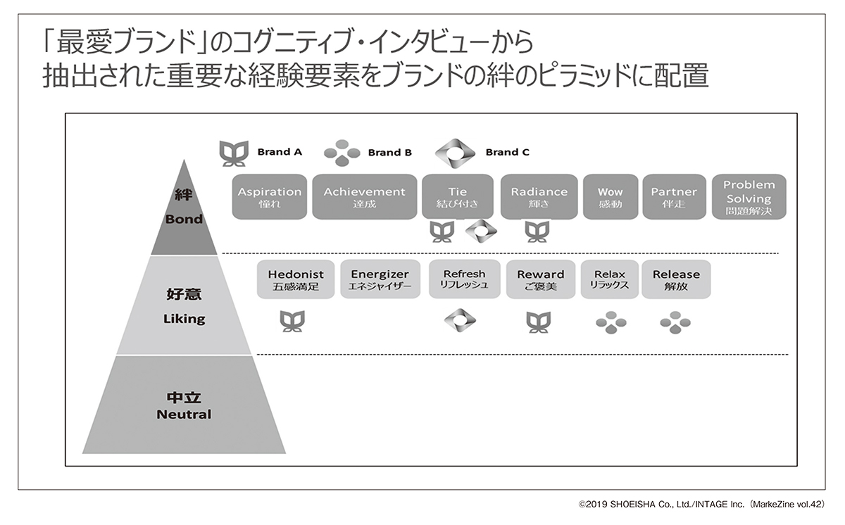 2015年8月に実施した20〜50代の女性対象者30名の自主調査を皮切りに、2018年には102件のインタビューを実施した。対象者と「絆」が形成されている最愛ブランド、または「好意」止まりのブランドなどについてのストーリーを聴取した。ブランド経験を包括的に捉えることを目的としたインタビューは詳細で膨大な量となるが、決まった手順によって要素を抽出していったところ、絆の形成のストーリーからは、以下のようなアイデンティティと重なる要素が抽出された。