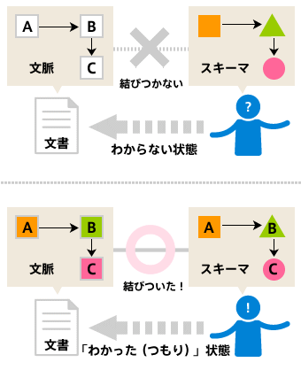 「わからない」という状態は、文章に書かれた文脈が自分のスキーマと結びつかない状態で、文脈による活性化が既存のスキーマに働いていない状態です。そこに、ある文脈が追加されることで手持ちのスキーマが活性化されると「わかった」という状態になります。しかし、「わかった」という状態は同時に「わからない」と感じていることがない状態でもあり、それゆえ、それ以上の読解の意欲が働かないため、本当はより深い理解が得られる余地が残された場合でも「わかった(つもり)」になってしまうということです。
