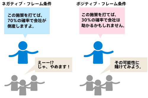 フレーミング効果とは、人が質問に答えるとき、一般的に人間の意思決定は質問のされ方によって大きく変わるというものです。その質問の表現方法を、判断や選択にとっての「フレーム」と呼び、異なるフレームにより異なる判断や選択が導かれる現象を「フレーミング効果」と定義しています。