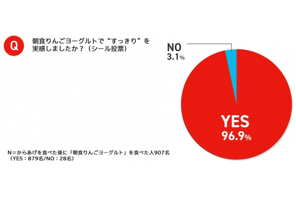 また、こちらも2018年ですがからあげの聖地である大分県・中津で開催されている「からあげフェスティバル」に出向き、来場者の方々にからあげを食べた後に朝食りんごヨーグルトを食べていただきました。そしてシール投票の結果、約97%の方が「すっきりした」と答えました。