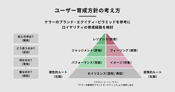クラスタリングによる顧客の理解を経たら、次にそれぞれのロイヤルティをどのように育てていくかのプランを検討します。私がこの時に参照しているのは、ケラーのブランド・エクイティ・ピラミッドモデルです。
