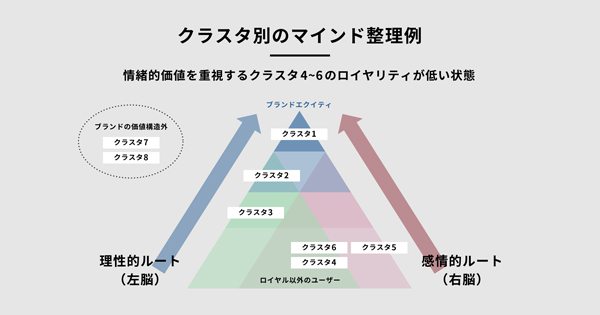 このフレームをもとに、1で抽出したクラスタをプロットしていきます。その際、利用満足度やNPSといった回答からロイヤルティの高さを判断し、価値観やライフスタイルに関する回答から左右のどの位置にプロットするかを決めていきます。