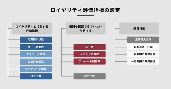 そのために、ロイヤルティの高低と顧客の行動との相関をとりましょう。具体的には、顧客のサイト内の行動や購買行動を分析し、アンケートでとった好意や信頼といったロイヤルティと相関の強いものを洗い出していきます。