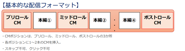 多くの動画広告は5秒でスキップできるようなものも多いですが、TVerの広告はスキップできません。主な配信フォーマットに、番組の前に流す「プリロールCM」、途中で流す「ミッドロールCM」、終了後に流す「ポストロールCM」があります。TVerのローンチ当初は、プリロールCMの再生完了率は6~7割くらいで、3割は残念ながら広告のタイミングで離脱していました。