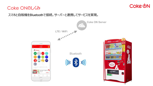 「Coke ON」の場合、Bluetoothを使って自販機と通信し、自販機からはサーバーに通信して購入履歴などを管理しています。現在ほとんどのスマホにはBluetoothが搭載されており、安価で使いやすい技術です。先ほど「テクノロジーが進化してやっと新しいイノベーションを展開できるようになった」といいましたが、それがこの点です。