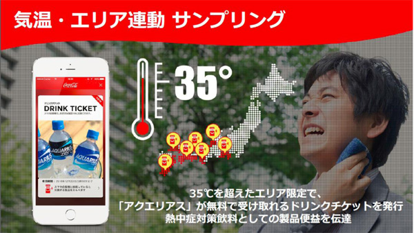 また、アプリの位置情報を活用して、地域や天候などに合わせたサンプリングやコミュニケーションも提案しています。2016年夏には、気温が35度を超えたエリアで、「熱中症対策で水分補給しよう」という文脈を使い、アクエリアスの無料サンプリングチケットを発行しました。するとお客様にも、「こんな暑い日にはアクエリアスだな」と認識していただけますし、今後当社がそういったメッセージを伝える助けになります。これこそ、デジタルとリアルが連携しているからこその仕掛けだと思います。