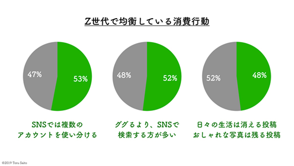 Y世代にとってはGoogle、Z世代にとってはSNSがネットの主役である。海のような情報群から必要なものを探し出す能力に秀でたY世代と比較して、Z世代の情報探索は受動的だ。手間をかけて探すまでもなく、SNS経由で必要な情報が届くからだ。それにGoogleは過去の情報であり、今この瞬間の情報はSNSにしかない。それゆえZ世代の約半数はあまりググらない。そのかわりSNSで興味深いものを見つけると、アカウントやハッシュタグで検索する。約半数のZ世代は、ググるよりもSNSを経由してお目当てのお店や商品に到達しているのだ。インスタユーザーの4人に1人が使うハッシュタグをどう選択するかなど、マーケターはSNS内のトレンドに目をむけることが大切だろう。