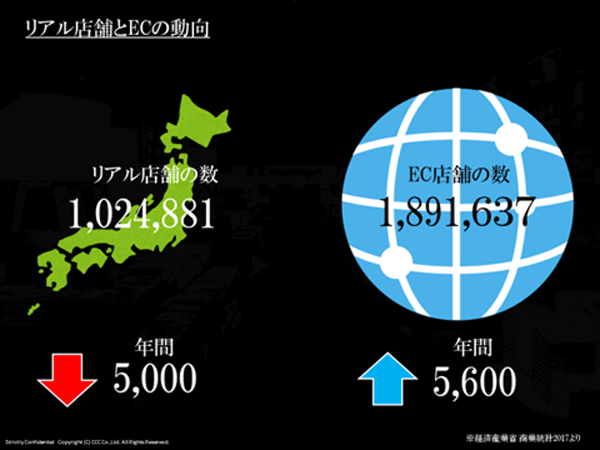 リアル店舗が直面している課題のひとつに、店舗で実物を確認し、ネットで購入するショールーミング化現象が挙げられる。これによりリアルではモノが売れなくなり、収益化に苦戦する店舗も出てきている。実際に、日本のリアル店舗の数は年間約5,000店舗のペースで減少しており、逆にEC店舗の数は約5,600店ほど増加しているそうだ。
