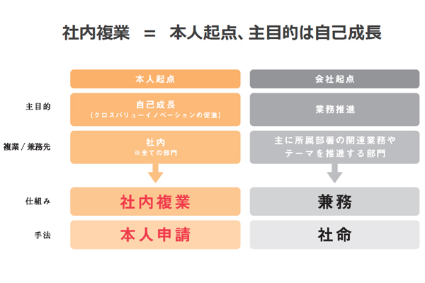いわゆる兼任や兼務と何が違うのか。兼任や兼務が会社起点で設定された業務推進を目的とし、社命として任命されるものである一方、社内複業はあくまで起点が本人であり、目的が自己成長に置かれている。個人が手を挙げれば、本業とまったく異なる領域にもチャレンジできる点が社内複業制度の特徴である。