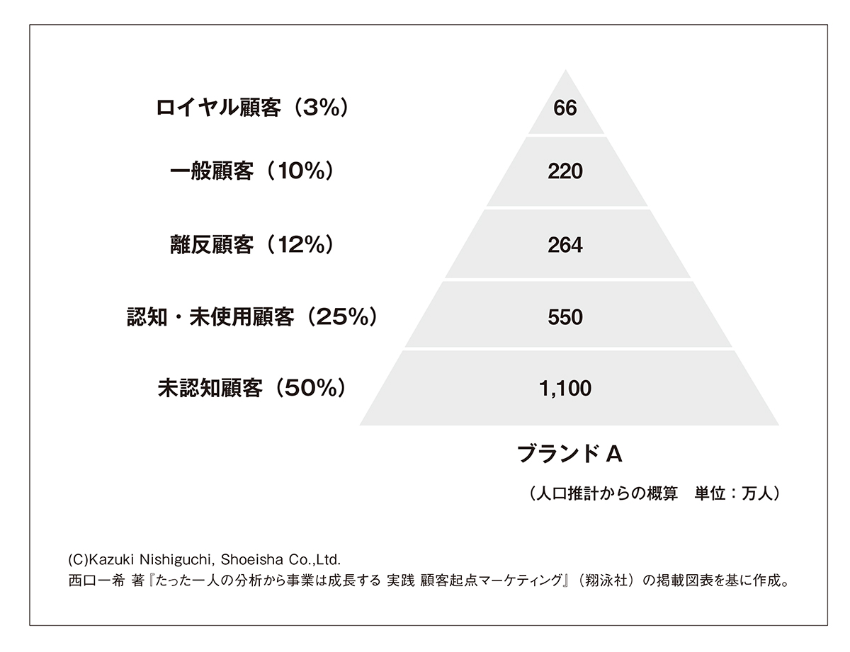 顧客ピラミッドは、その各層も、調査での出現率と人口推計を掛け合わせて推定人数を出すことができます(図表2)。