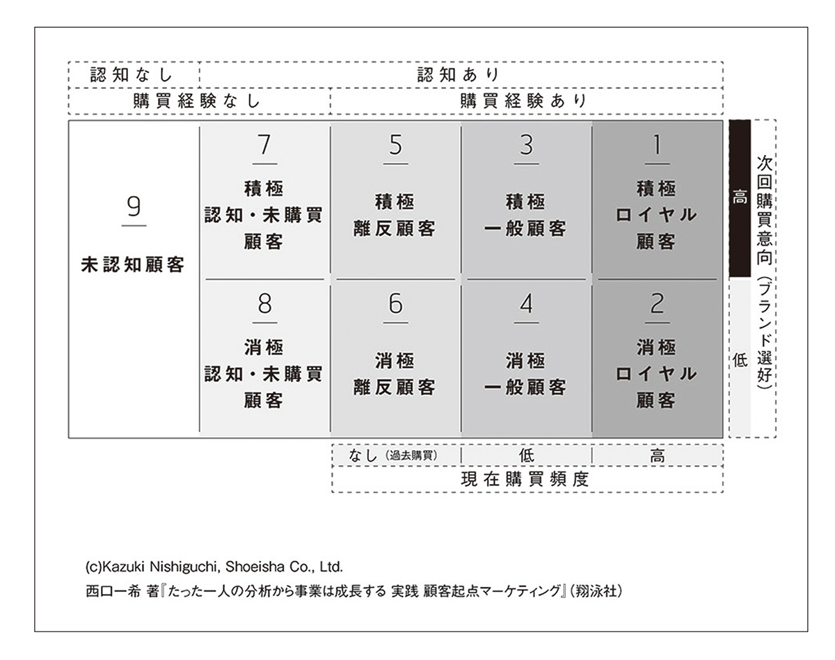 図表3 顧客ピラミッドの上位4層を「次回購買意向(ブランド選好)の有無」でさらに2つに分解した「9セグマップ」。下層(偶数セグメント)の人は、次に買うという明確な意志がないので競合や代替品などに奪われやすい。