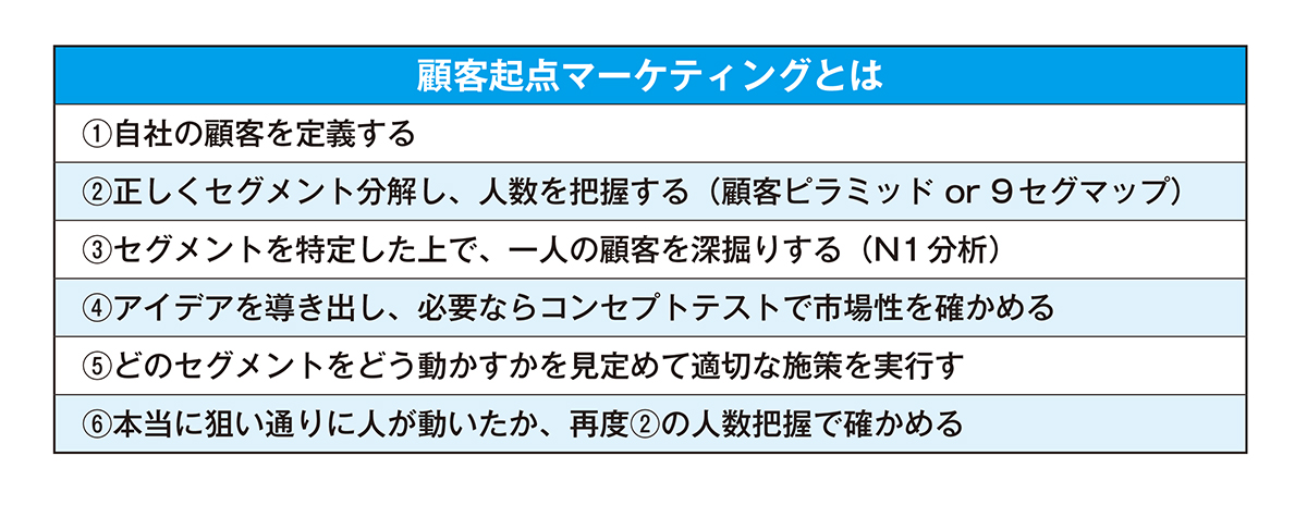 先に紹介した顧客ピラミッドまたは9セグマップの作成は、顧客起点マーケティングの一部で、全体は以下のようになっています。本稿では①と②をCRMの観点から解説し、マーケティング施策によって各セグメントの人数が動いたかを確かめるというフレームワークの運用(【5】と【6】)に少しだけ触れました。すべてを紹介しきれませんが、この一連の流れを繰り返すことで、確実な事業成長が見込めます。