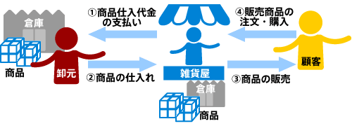 では、ドロップシッピングの流れを見る前に、基本的な商品販売業の販売・流通方法をみてみましょう。例えば、近所によくある家族経営などの雑貨屋を思い浮かべてみてください。そして、そのお店に皆さんが顧客としてお買い物にいって商品を購入したとしましょう。