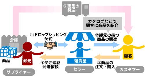 ちなみに、通常の商品販売業のイラストと比較をしてほしいのですが、ドロップシッピングの場合の流通フローを図示すると上記のようになります。