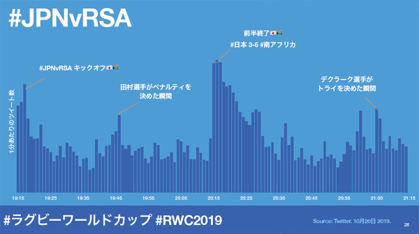 これらの特徴ある取り組みが功を奏し、日本対南アフリカ戦を見ても、ハーフタイムやデクラーク選手がトライを決めた瞬間など、様々な場面で会話量の山を作ることができたという。