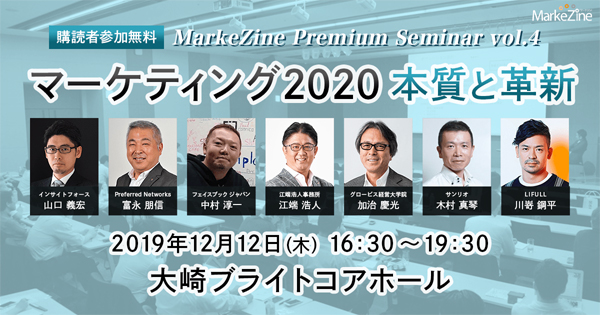 MarkeZine編集部は12月12日(木)、大崎ブライトコアホールにて「MarkeZine Premium Seminar vol.4」を開催します。今回のテーマは、「マーケティング2020 本質と革新」。マーケティングにおける不変的なこと、来るべく2020年に訪れるであろう最新のトレンドを、7名のスピーカーの方々とともに考えていきます。江端さんと川嵜さんも登壇予定です! ぜひご参加ください。