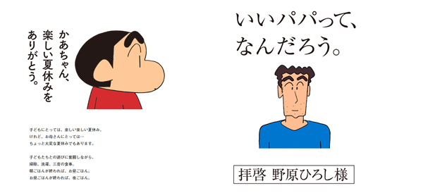 また、このキャンペーンが上手かったのは、シリーズ化して世の中ごとのタイミングに足並みを揃えていたところ。第1弾は母の日に「野原みさえ」さん宛、第2弾は父の日に「野原ひろし」さん宛にメッセージを綴りました。そして第3弾は夏休みが終わる直前に「しんちゃん」目線で母への感謝を綴るというタイミングが絶妙でした。