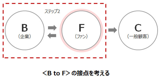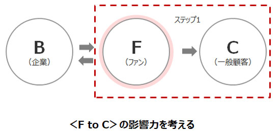 最初のステップでは、ファン(Fan)の熱量をどのように一般の顧客(Consumer)に伝えていくか、つまり<F to C>の影響力を考える。企業(Business)がファンに対してどのようなコミュニケーションをするかという、<B to F>の観点のみに着目してしまうと、前述のように、過度なおもてなしによるコミュニティの疲弊に陥る場合が多い。