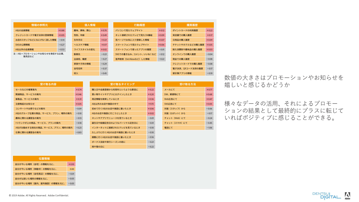 この効用値は、企業のお知らせやプロモーションに関わる事柄を「情報の参照元」「個人情報」「行動履歴」「購買履歴」「受け取る内容」「受け取るタイミング」「受け取る方法」「位置情報」のカテゴリーに分け、その中の細かな項目が消費者にポジティブに作用するか、ネガティブに作用するかをそれぞれプラス、マイナスの数値で示したものだ。