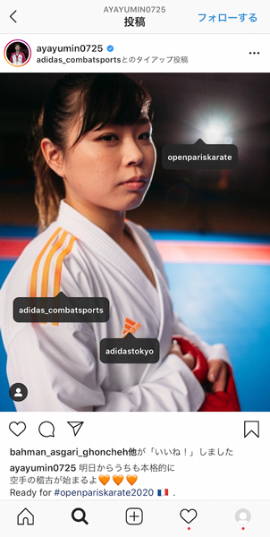 たとえば、女子空手選手の植草歩選手はブランドコンテンツツールを使い、空手衣を紹介しながらアディダスがスポンサーであることを明示しています。